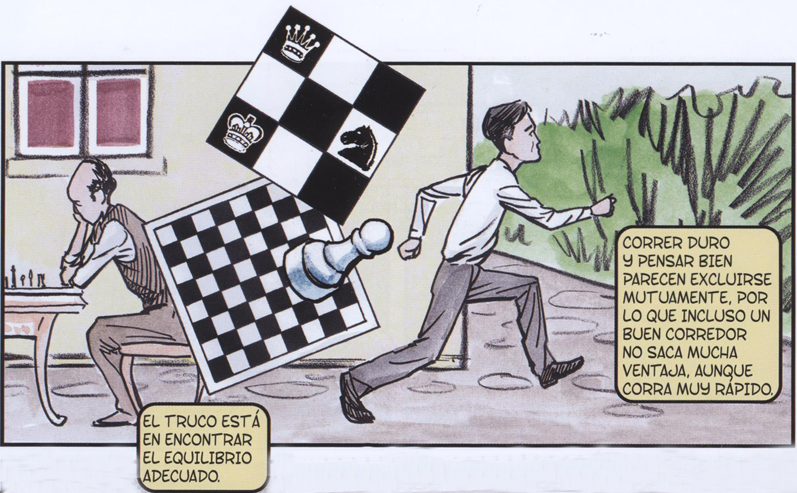 Por otra parte, la posibilidad de dejar poco tiempo de reflexión al contrario puede impeler al corredor a forzar la máquina. A ir muy deprisa. Aunque luego la fatiga, el pulso acelerado y otros efectos, dicen que salutíferos, de correr no ayuden precisamente a una correcta valoración de la posición. Así que se trata de encontrar el equilibrio entre ambos elementos del juego: la reflexión y el esfuerzo físico.
