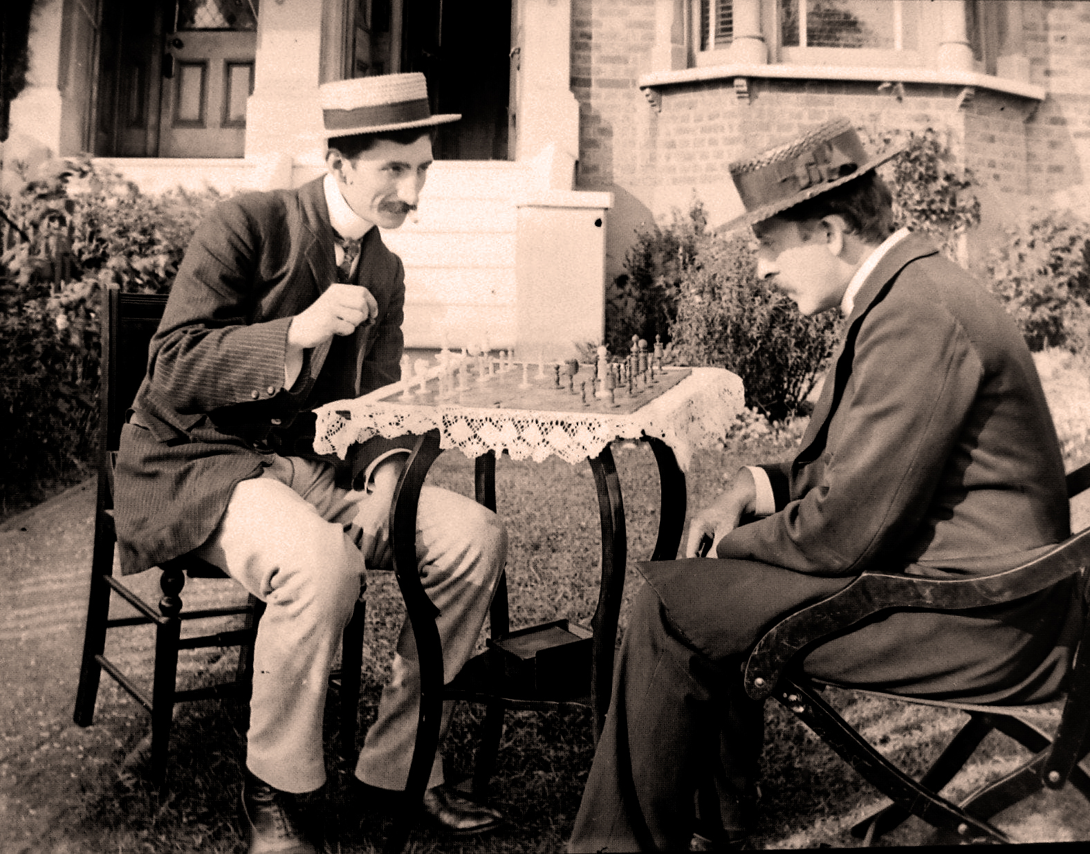 Fotografía de época eduardiana (1901-1910) de dos caballeros jugando al ajedrez en el jardín de una casa inglesa. Una imagen que puede ilustrar bastante bien la casa del magnate Sigbee Manderson descrita en la novela. La fotografía está fechada a principios del siglo XX y la novela fue publicada en 1913 por lo que ambas obras son coetáneas.