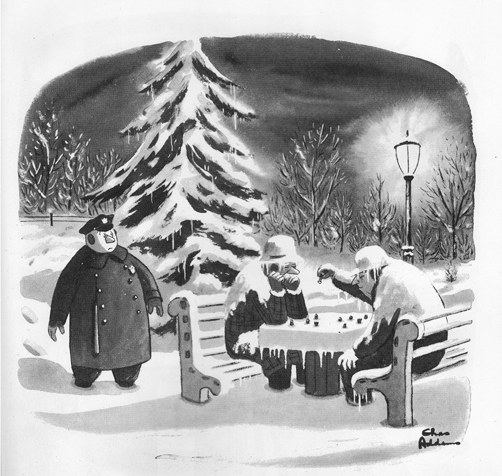 Viñeta (y dibujo preparatorio) de Charles Addams titulado "Chess in Central Park" (1950 aprox.) en la que la brillantez del juego ha dejado literalmente helados a los jugadores. Addams fue un dibujante norteamericano conocido por su humor negro y su marcada tendencia hacia lo macabro y lo siniestro. No en vano fue el creador de la célebre familia Addams, que antes de ser película, y aún antes de ser serie de televisión, fue viñetas cómicas que se publicaban en The New Yorker.