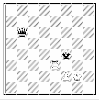 Para el lector no avezado diremos que la posición es de tablas ya que con un peón en la segunda fila, salvo que sea el de torre, consigue entablar siempre que la torre y el rey estén próximos porque no existe posibilidad de que las piezas negras rodeen al rey blanco.