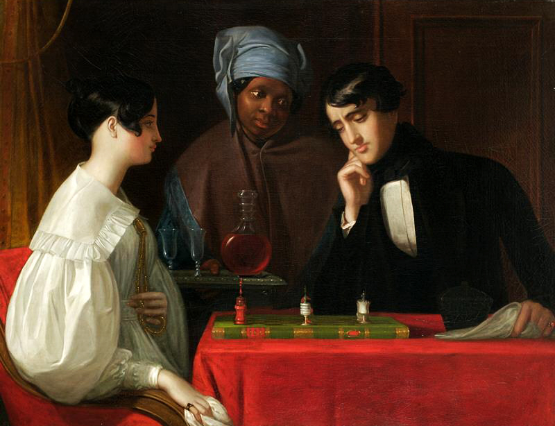 No conocemos los nombres de los jugadores, pero dado que Flagg trabajó preferentemenre en Carolina del Sur, amen de la presencia de una criada negra presumiblemente esclava, podemos pensar que la pareja de ajedrecistas pertenece a la burguesía sudista que solo unas décadas después de pintado este cuadro vería cuestionado su modo de vida en la Guerra de Secesión.