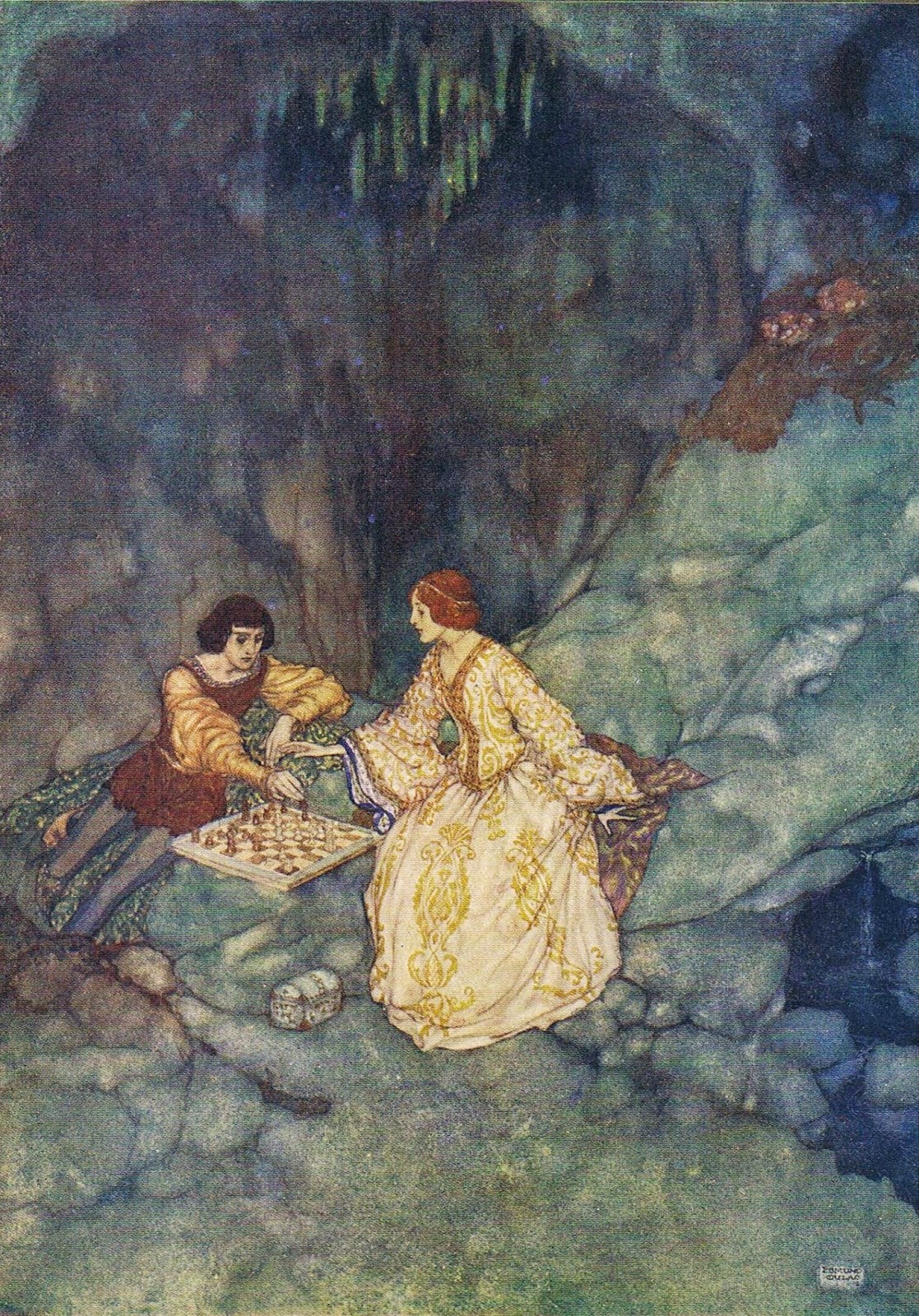 Alonso, rey de Nápoles, y Próspero, duque de Milán, descubren a sus hijos respectivos, Ferdinand y Miranda, a los que creían muertos, jugando al ajedrez en una cueva. Los jóvenes mantienen el diálogo que tantas veces hemos reproducido en ARTEDREZ: